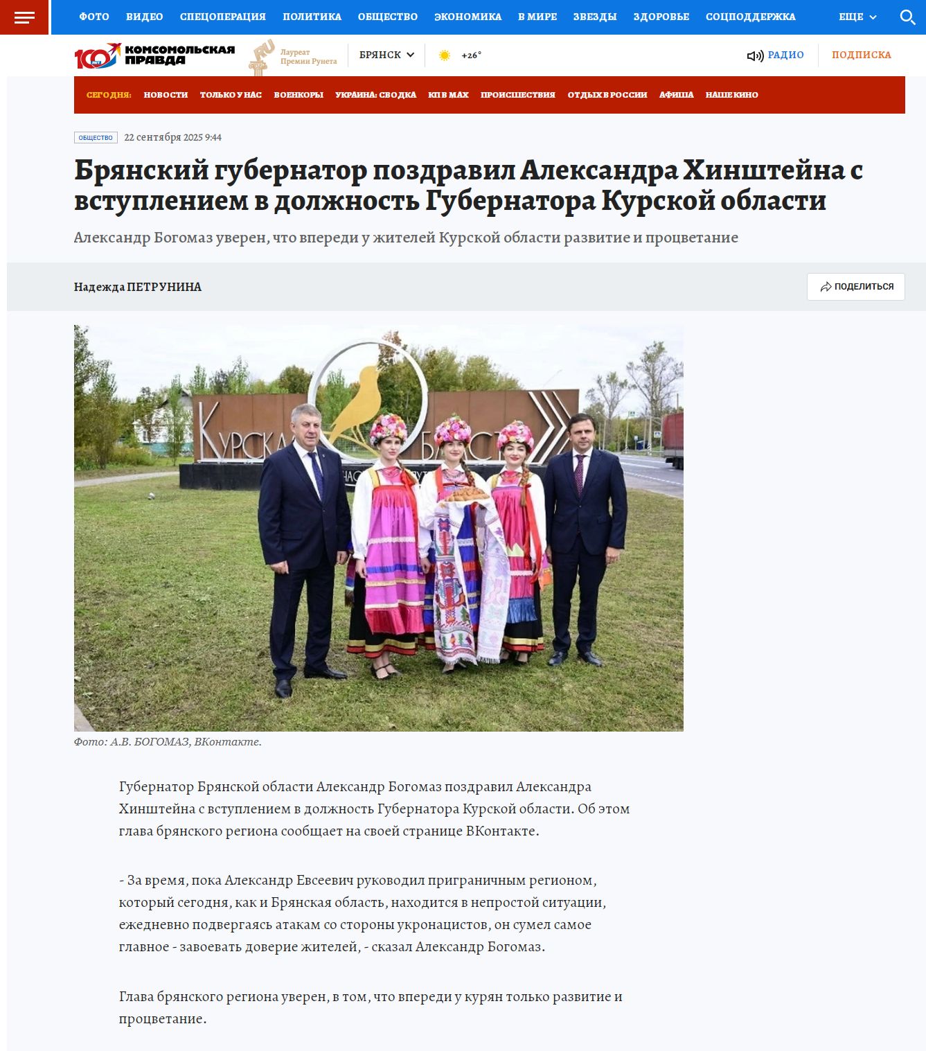 С другим фото, правда, прогубернаторские СМИ немного напутали. Новость «Брянский губернатор Александр Богомаз поздравил Хинштейна с инаугурацией» пиарщики проиллюстрировали фотографией, где этого самого Хинштейна нет: на нём изображены Богомаз, три барышни в народных костюмах… и губернатор Орловской области А.Е. Клычков. Со ссылкой на соцсети самого нашего губернатора.